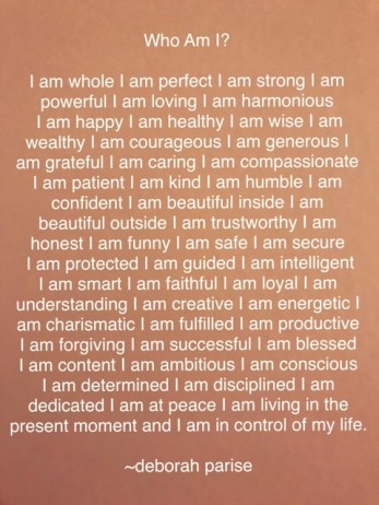 Whenever you are aware of self-criticism, here are some positive affirmations to repeat that will bring you back to who you really are. The list is endless, but of course, I had to stop somewhere. At the beginning of each statement, always use these two significant words: “I am.” And remember, God made you perfect.